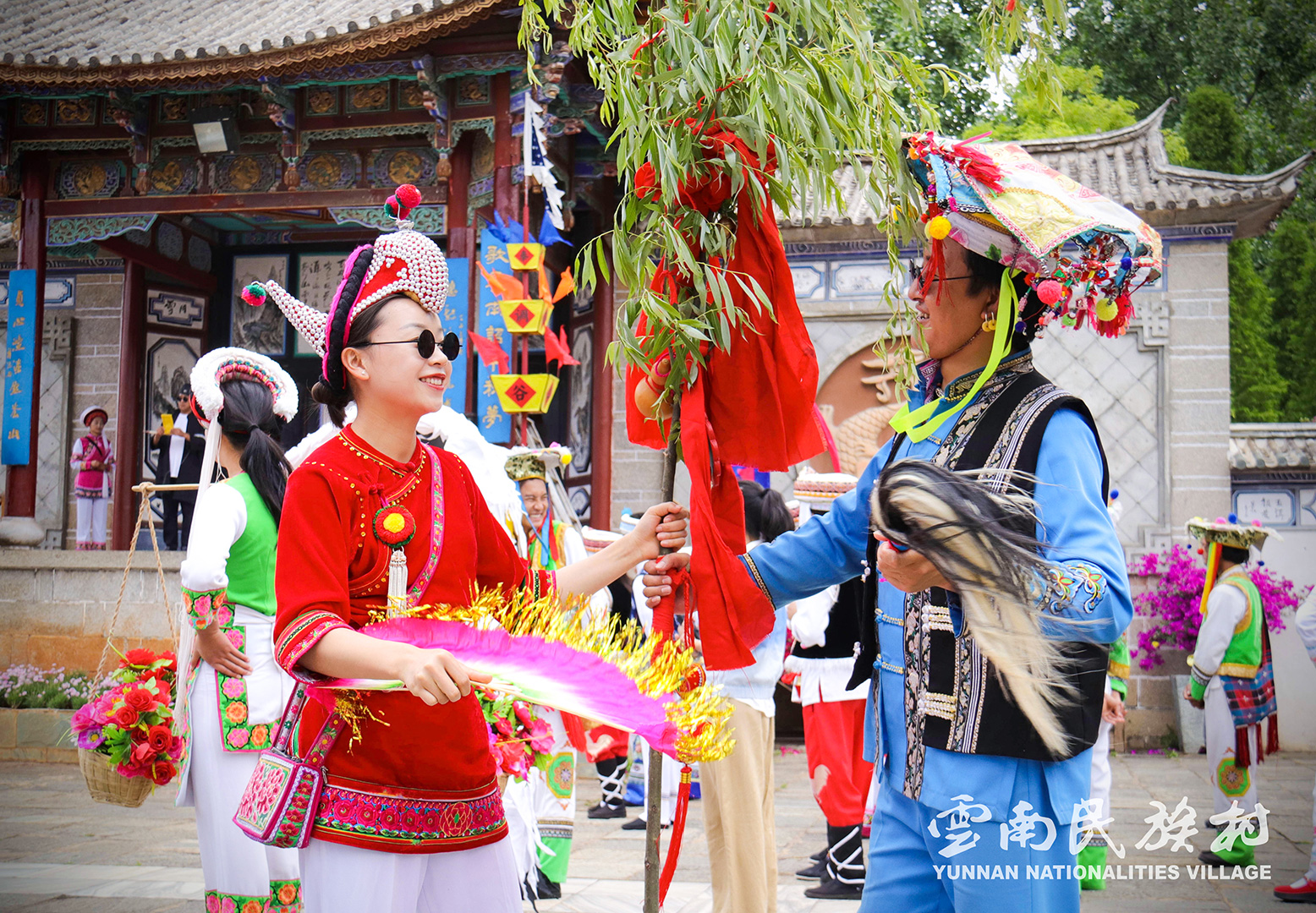 彝族在云南境內(nèi)約471萬人,是省內(nèi)人口最多、分布最廣的少數(shù)民族,主要聚居在金沙江、元江流域和哀牢山、無量山腹地。彝族是一個能歌善舞的民族,民間打歌、跳樂之風(fēng)盛行,大三弦、跌腳舞久負(fù)盛名。火把節(jié)是彝族最具特色的民族節(jié)日。彝族村占地50余畝,三虎浮雕墻與虎頭內(nèi)祖師形象表現(xiàn)了彝族虎鷹文化。太陽歷廣場圖騰柱上有太陽、虎、火和八卦圖形象,周圍環(huán)繞著10個朝向不同的月球造型,外圓周有12生肖石雕。依山而建的“...